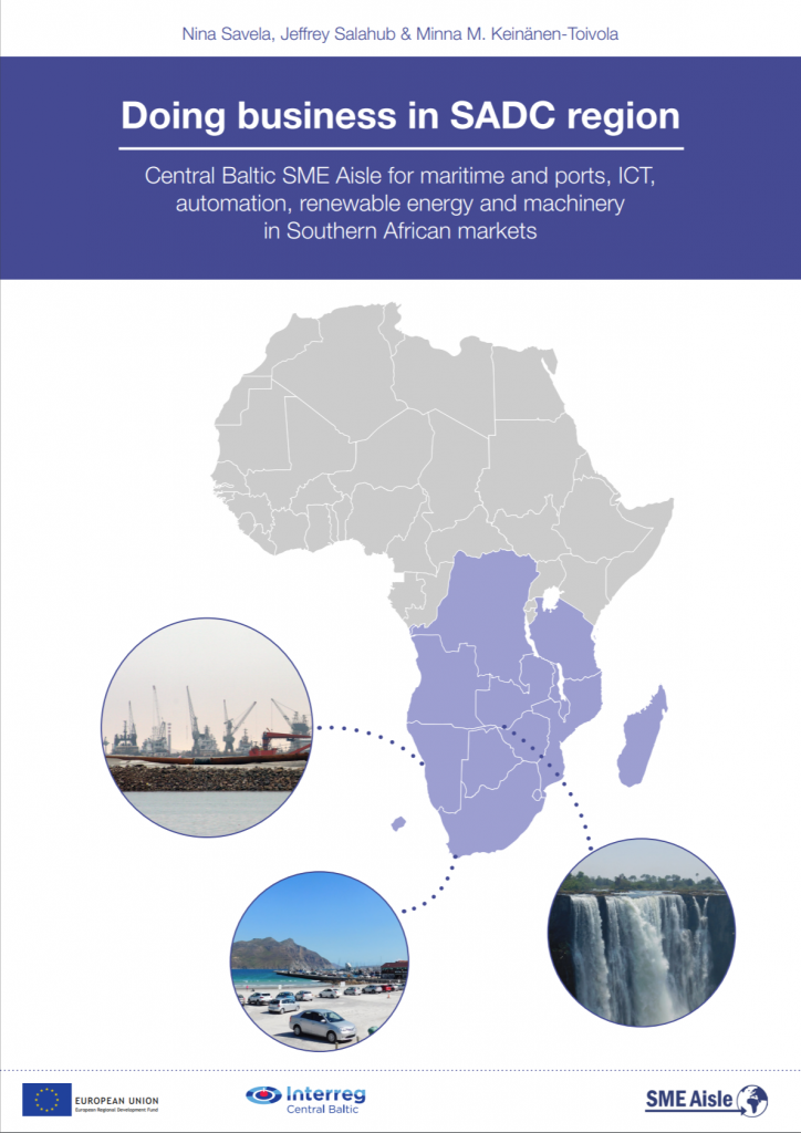 Savela N., Salahub J., Keinänen-Toivola, M.M. (2018). Doing business in SADC region. Central Baltic SME Aisle for maritime and ports, ICT, automation, renewable energy and machinery in Southern African markets. Satakunta University of Applied Sciences, Series B, Reports 13 /2018. 103 pages. Available online: http://urn.fi/URN:ISBN:978-951-633-263-8